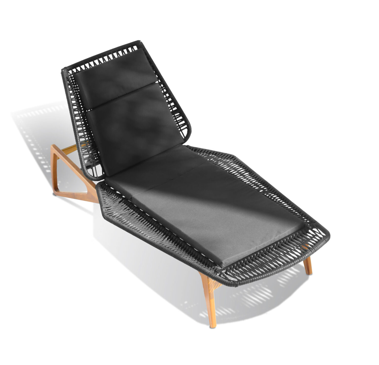 Em uma simbiose entre o deck e o móvel, a estrutura de madeira de bordas arredondadas e em formato triangular, traz leveza e originalidade a espreguiçadeira MARINE, que se contrapõe com as formas hexagonais dos trançados em corda náutica, em um mix de materiais, texturas e aquela sensação agradável de conforto e relaxamento.